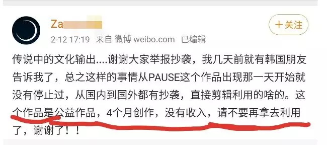 而国内原版《Pause 2017 Opening Titles》的作者在事情发酵后也作了回应,称早就有韩国朋友告诉过他这件事情,还解释到这个作品花了他四个月心血创作,是公益作品,他本身并没有收入。现在他正式向《梨泰院CLASS》方表态希望他们不要再拿去利用。