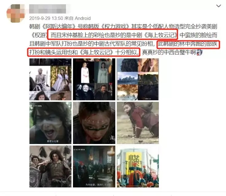 除此之外,韩剧《阿斯达编年》也被扒出借鉴了《海上牧云记》,有网友称宋仲基脸上的彩绘和《海上牧云记》中蛮族脸绘相似,而且林中奔跑的部族打扮和镜头运用也很雷同。