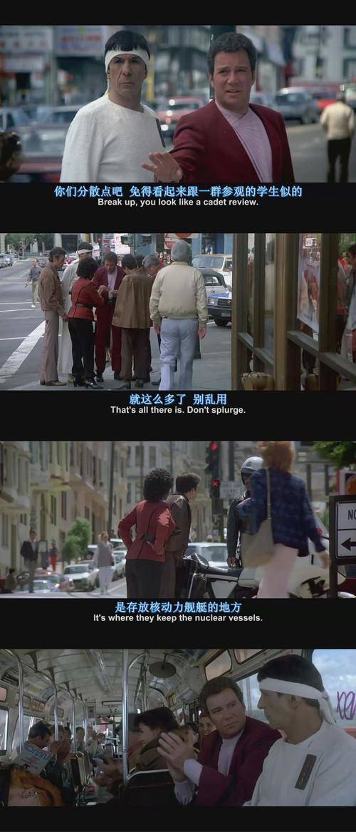首先Enterprise的制服在那个年代的人看起来就是很奇怪的,Kirk舰长发号施令说不能让他们发现我们不是这个时代的人,于是Spock君就从衣服上扯了布条把眉毛挡上了(萌翻)。Kirk还当街给大街分钱,还不忘嘱咐“就这么多了,别乱用”。Chekov和Uhura在大街上看到警察就问他们要找核潜艇,还以为人家会热心帮忙呢。还有Spock在公交车上用瓦肯杀制服了一个小痞子,全车人都热烈鼓掌,相当赞啊!更不用说那个一直喊“Computer”的梗了,当时都给我笑抽了。