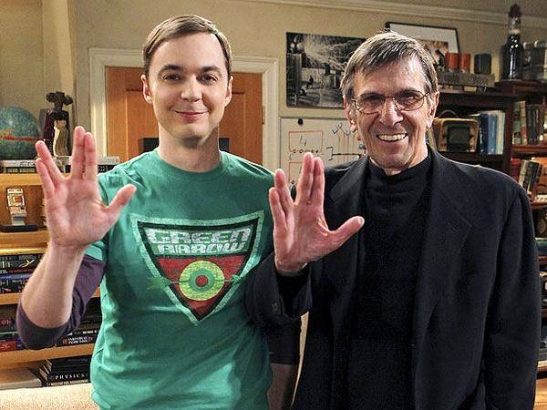 (Sheldon和老版Spock的饰演者Leonard Nimoy的合影,并亮出“Live long and prosper”的手势。)
