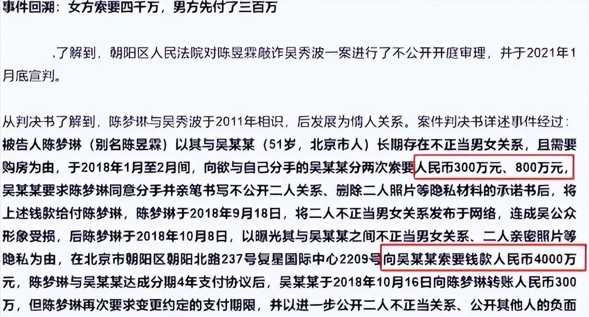 但事后不久,陈昱霖又向吴秀波威胁说要公开他的黑料,并再次索要总金额高达4000万元的封口费,吴秀波也害怕这件事情败露,最后也只得同意了陈昱霖的要求,两人再次达成了协议。