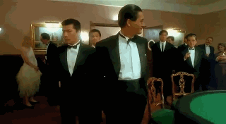 当发哥穿着黑色西装,从门外走进来的时候,他光用个人气质就撑起了整个场面,身边的所有人顿时沦为背景,配合一首经典BGM,造就了“赌神出场”的港片经典片段。
