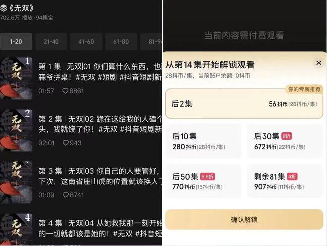 如果给这类剧一个画像,基本如下:一集时长 1 分左右,总共 100 集左右,通过抖音快手等平台投流带来精准流量,吸引用户跳转微信小程序或抖音小程序或快应用等平台观看,一般前 15 集免费,随后通过设置付费点,利用关键时刻的剪辑吸引观众付费观看后面的剧集,一部剧一般要花费几十元到上百元不等。