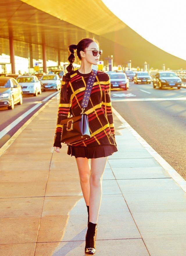 张馨予,格子毛衣搭配短款百褶裙,踩着黑色高跟单鞋,露出性感的大长腿,青春时尚