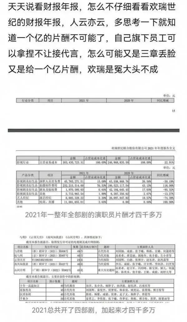 不过也有杨紫的粉丝解释称,杨紫之前所在的公司欢瑞世纪 2021 年一整年全部剧的演员片酬加起来才四千多万,而且公司旗下的艺人都不让姐广告代言,所以杨紫的天价片酬简直是无稽之谈。
