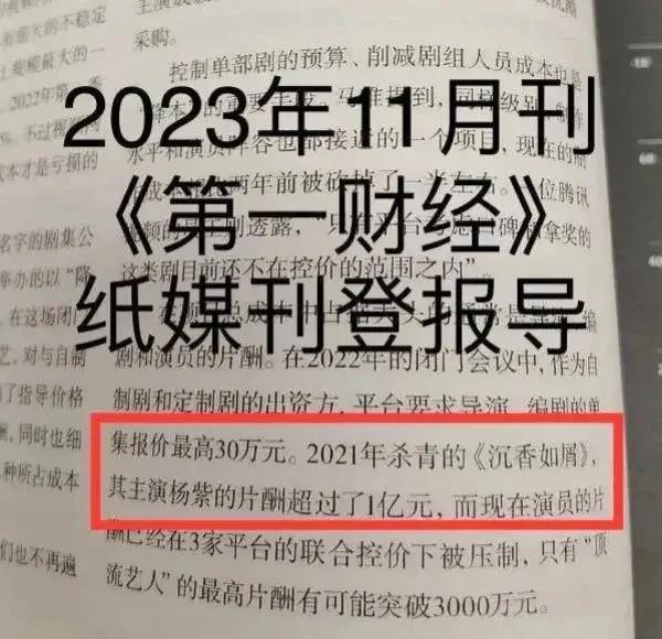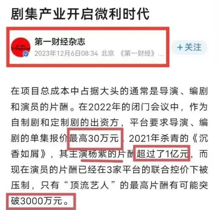 近日有网友发现,在《第一财经》2023 年 11 月刊发布的文章中指出,作为定制剧和自制剧的出资方,平台要求导演、编剧单机集的片酬最高不能超过 30 万元,其中杨紫 2021 年杀青的古偶剧《沉香如屑》就已经超过了 1 个亿,如今演员的片酬在 3 方平台的压制下,只有 " 顶流艺人 " 片酬可达到 3000 万元。