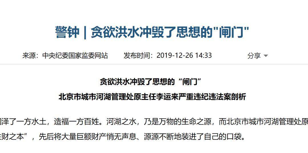 讽刺的是,李运来的前任、北京市河湖管理处原主任李柱在任职期间,利用外包河湖工程向建设单位索贿,并以虚报工程、私设账户等手段贪污公款,涉案金额巨大,终审被市高院判处死缓。