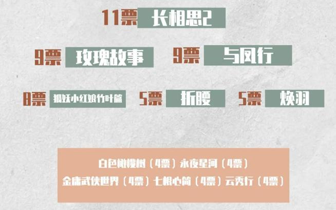 在已杀青的剧集里,媒体们最期待的前三部剧分别为《大奉打更人》、《庆余年 2》和《狐妖小红娘月红篇》。