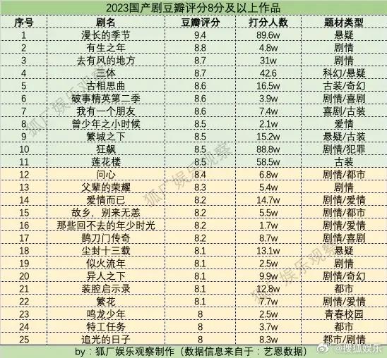 去年(2023 年),国产剧豆瓣评分在 8 分及以上的作品多达 25 部,创下近五年来豆瓣 8 分剧最多的记录。