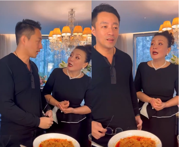 只见张兰化着浓妆,气色红润有光泽,穿着一件黑色长裙,脖子上戴着硕大的珍珠项链,显得珠光宝气,十分有气质,一点都看不出是63岁的人。只见张兰用宠溺的眼神看着比自己高一头的儿子汪小菲,问他怎么突然这么瘦了。