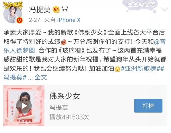 自2017年下半年以来,冯提莫便开始有出单曲的准备,直播间和微博也能多次看到其发布的状态。2017年10月,发布个人单曲《沈洁洁》,之后在短短半年内(截止2018年4月)发布了3首个人单曲《佛系少女》、《玻璃糖》以及电影《前任3:再见前任》同名宣传单曲《再见前任》。