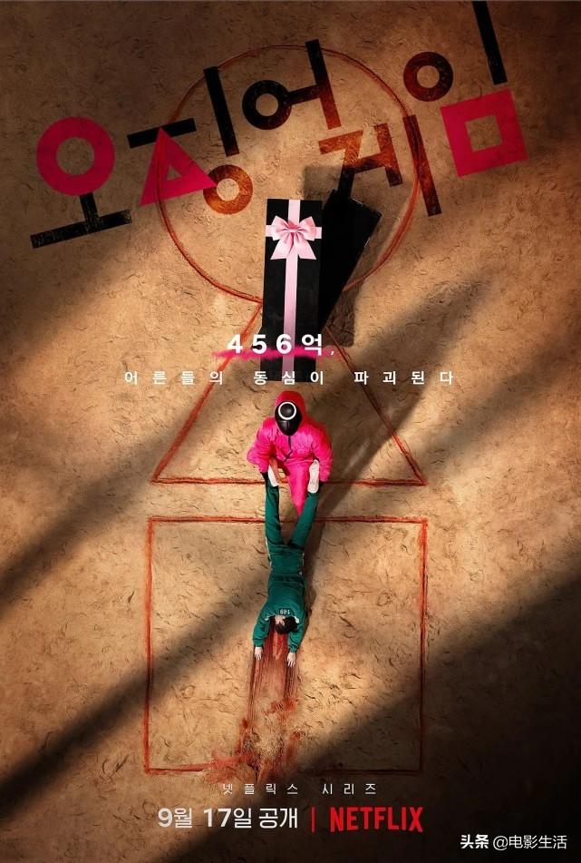 鱿鱼游戏实际上是从1980年开始在韩国流行的竞争游戏。从海报上可以看出,巨大的鱿鱼图案是由圆圈、三角形、方块和血迹组成的,分布在不同阵营的敌人中。通过杀死对方赢得比赛,鲜艳的色彩相当童趣,但在混合了无法抹去的血液后,整张海报看起来很奇怪,很有视觉冲击力。