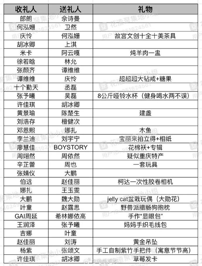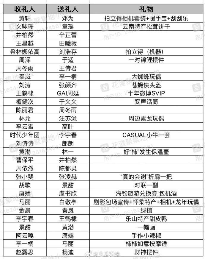 豆瓣这几天把明星们准备的礼物和抽到的礼物整理成了表: