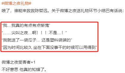 后来陈哲远解释说,自己也不知道要送什么,(尖叫)微博之夜那么长,瓜子刚好解闷啦。