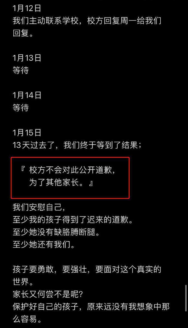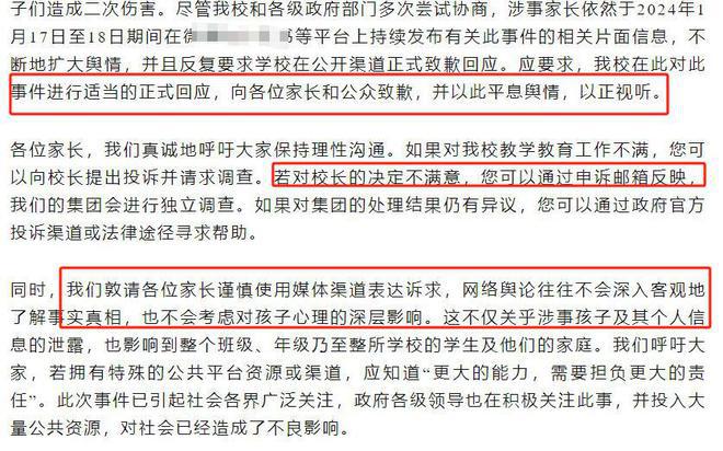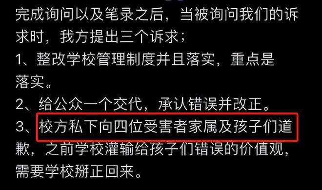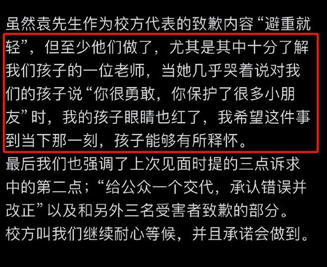 不过,通过郝劭文晒的记录来看,当中提及到的 " 校方不会对此公开道歉,为了其他家长 " 的说法并不准确。当然,也可能双方互相退让一步有了妥协。根据校方家长书一文来看,校方有明确回应此事,碍于家长的要求,特此道歉,希望平息舆情以正视听,也希望家长有问题谨慎使用媒体渠道控诉,而是通过官方渠道。