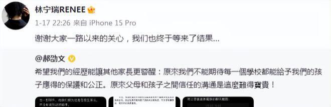 而在这之前,她转发了郝劭文的控诉文感谢大家的关心,称终于等到了结果。从郝劭文的措辞能看出,郝劭文对事件的结果并不满意,不然不会说出:原来我们不能期待每一个学校都能给予我们的孩子应得的保护和公正。