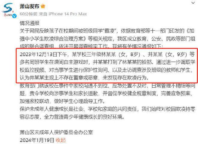 郝劭文女儿被霸凌事件终于出结果了!据萧山发布通报,通过调取校园监控、询问当事学生、走访调查等方式,认为孩子之间相处没有发现存在欺凌行为。
