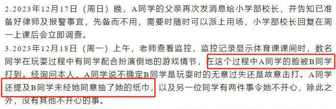 结合萧山通报与校方告家长书两份文件,可以清楚看清孩子之间发生的具体矛盾,其一是游戏环节 A 某被 B 某打到,其二是 B 某未经同意抽取了 A 某纸巾。而这两项行为都不存在蓄意或恶意,从而霸凌不成立。
