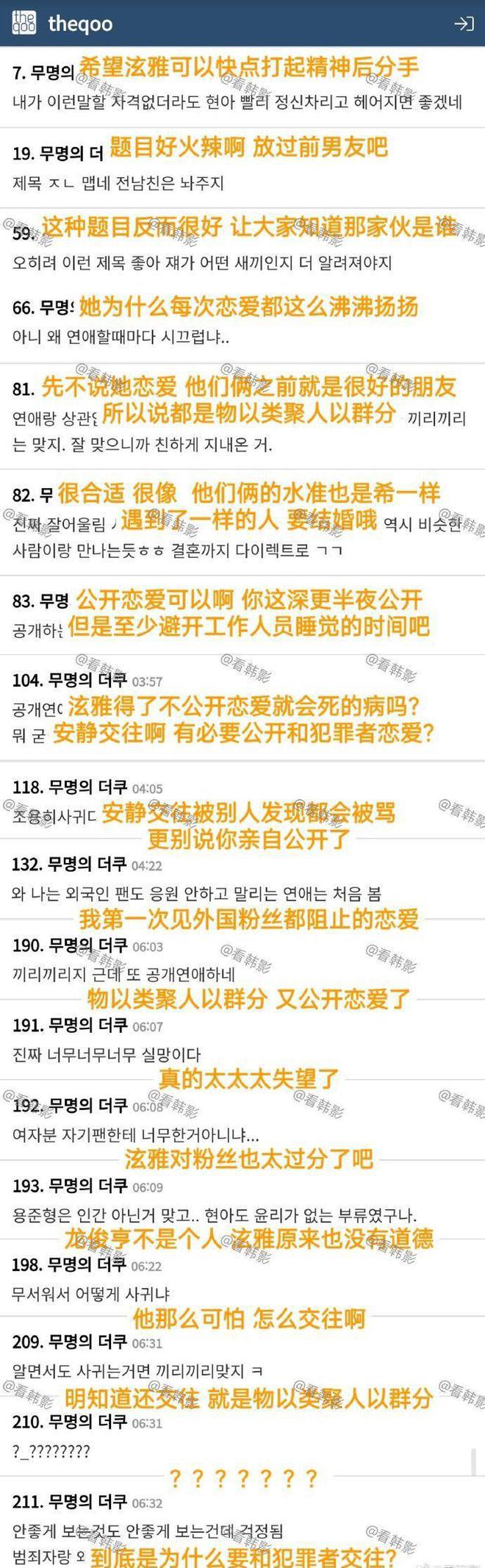 面对网友的激烈批评,有人留言称:" 泫雅难道没有男人就活不下去吗?"、" 这是我见过的最不顾一切为男人疯狂的艺人了。" 更有甚者以 " 物以类聚,人以群分 " 的古训来评价这段恋情,直言:" 世界上的男性这么多,为什么偏偏选择了有过偷拍污点的人?" 甚至有网民直接攻击泫雅个人品质,声称她因此而显得 " 很脏 "。