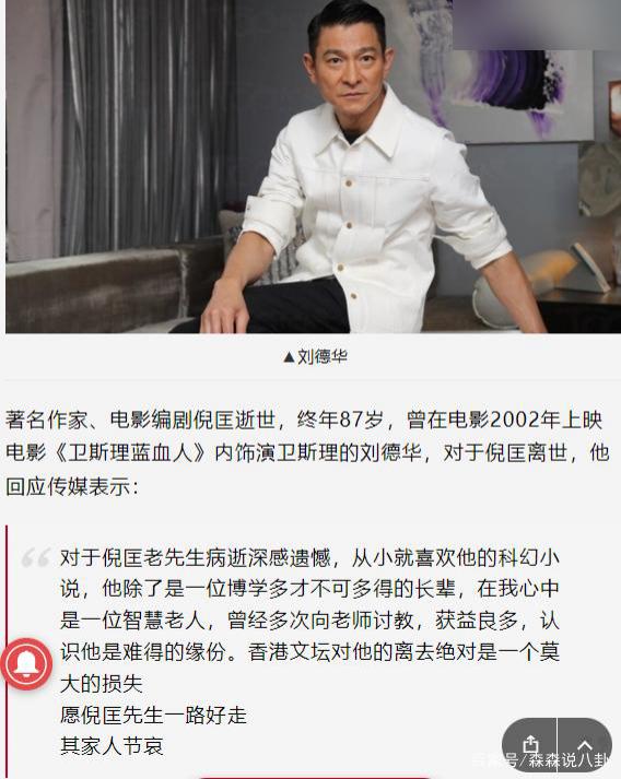 刘德华伤感悼念倪匡:曾经多次向老师讨教,获益良多,愿一路