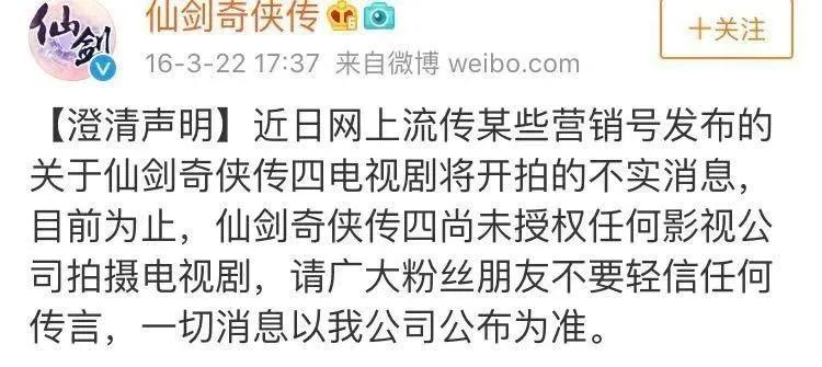 几个月后,仙剑官方发布微博称,尚未授权给任何影视公司。