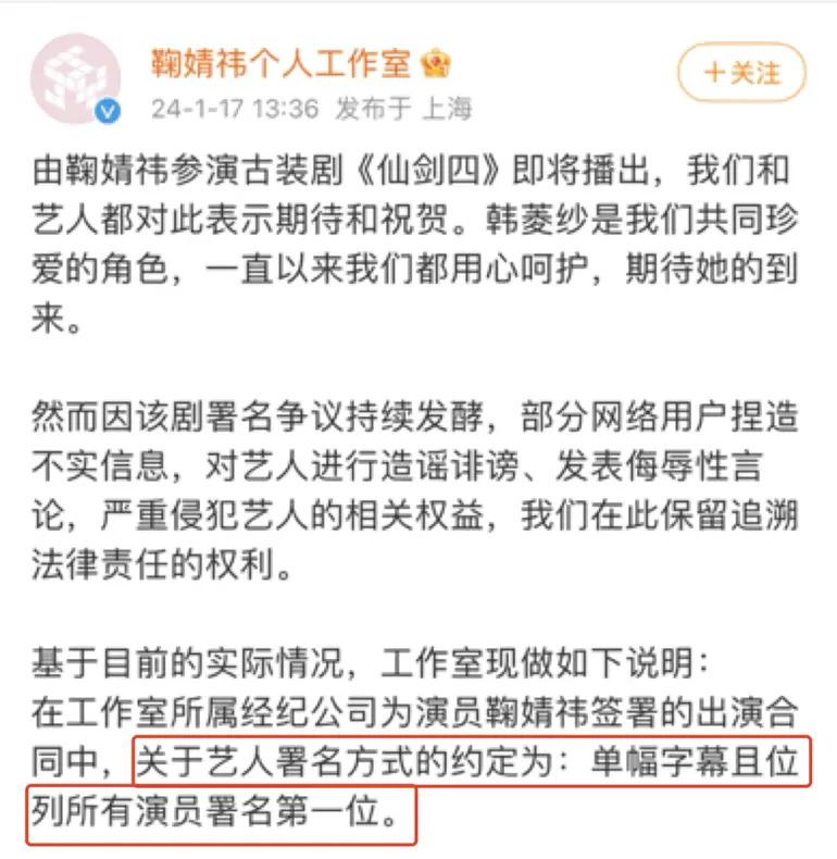 鞠婧祎方称,《仙剑四》片方违约,她签的合同中明确指出自己名字排在第一。