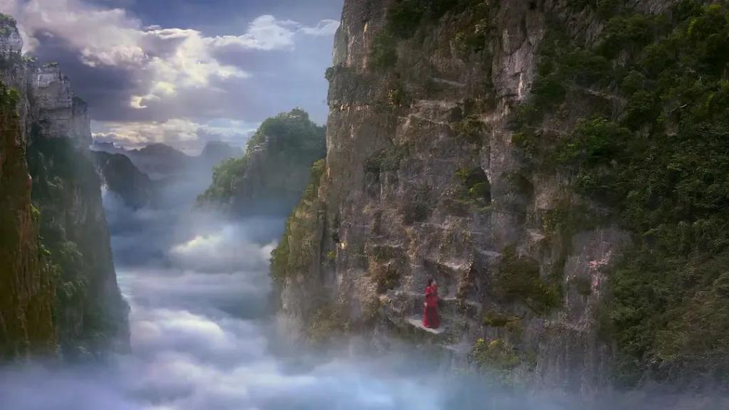 这时,我们一袭红衣仙女裙的女主韩菱纱,为了找东西,正在爬山之中。