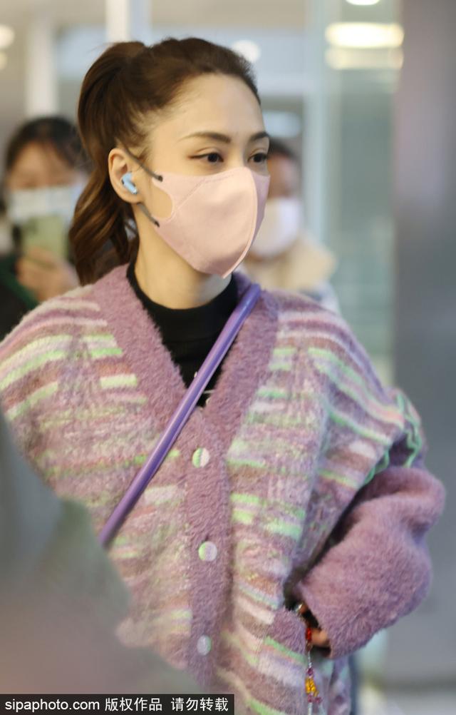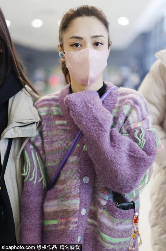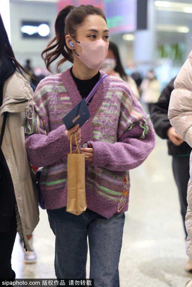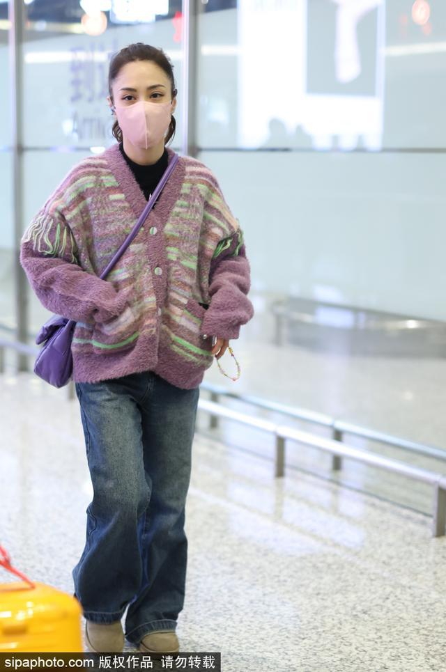 阿娇现身机场好随和 着紫色毛衣外套搭配牛仔裤不失时尚