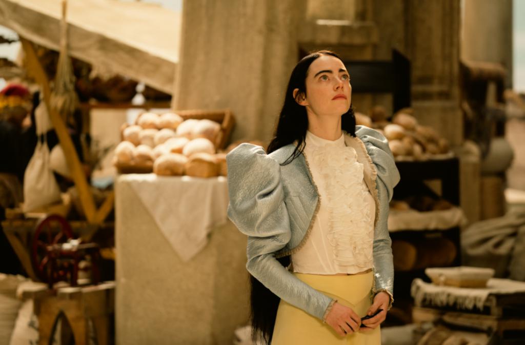 艾玛在《可怜的东西》里的扮相,完全褪去了金发碧眼俏女郎的浪漫轻盈,严肃古板的未经梳妆过的黑发、尽情袒露的雀斑与褶皱,有人甚至说,这样的艾玛再没了往日的光,总感觉她变 " 普 " 了。