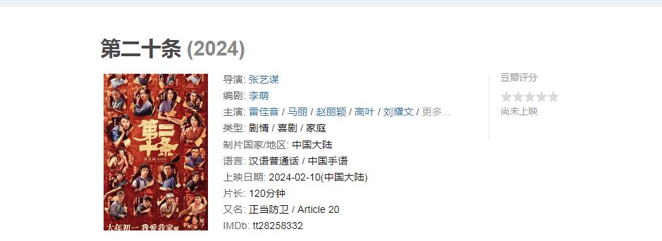 即将要上映的作品是张艺谋导演的春节档贺岁片《第二十条》。