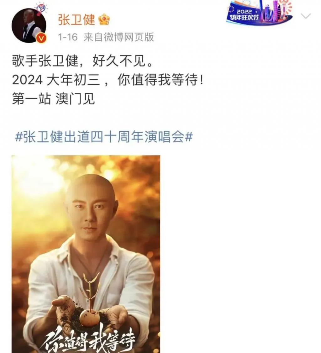 这次张卫健筹备的演唱会,也是为了庆祝他出道四十周年,演唱会则计划在大年初三热热闹闹的举办。