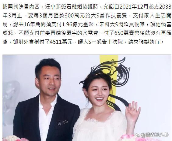台媒指出,汪小菲一共要支付 1.96 台币的抚养费,因为大 S 再婚所以不愿继续支付,长期拖欠费用才被大 S 告上法院。