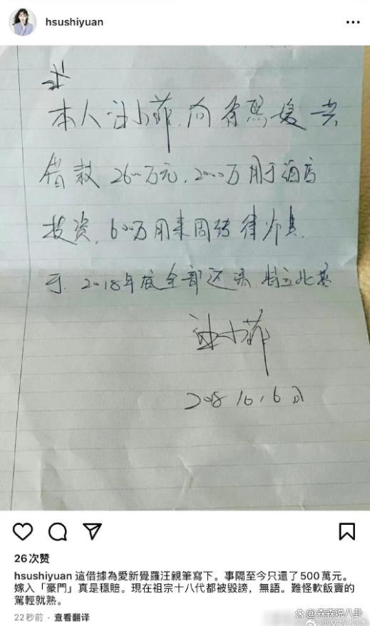 值得一提的是,台媒并未采访大 S 及汪小菲确认 3 亿台币的金额,他们是通过大 S 之前在微博发布的借单,以及大 S 近日发声明称 " 恶意夸大的金额 " 为准,认为汪小菲至今只支付了 650 万台币,似乎有失偏颇。