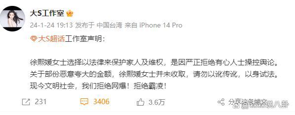 对此,大 S 透过经纪人发声明否认,指有人操控舆论:" 关于部分恶意夸大的金额,熙媛并未收取,请勿以讹传讹,以身试法。"