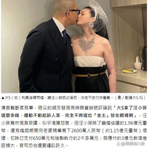 有趣的是,台媒指汪小菲应该支付的金额是 3 亿台币,除了 1.96 亿台币的抚养费,婚内还向大 S 借款 1.15 亿台币(2600 万人民币),已支付的 650 万台币及强制执行的 2000 多万台币,只是冰山一角。