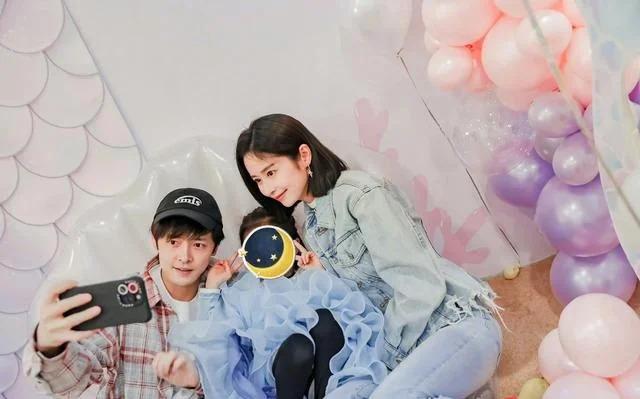 照片中,颖儿穿一身牛仔套装,打扮时髦靓丽,尽显青春活力。付辛博头戴棒球帽,身穿粉色格纹衬衫,打扮十分帅气。小月亮身穿蓝色公主裙,甜美可爱,妥妥的公主范。一家三口席地而坐,靠在生日背景墙前合影,真的好幸福。