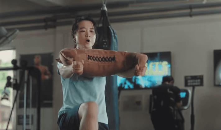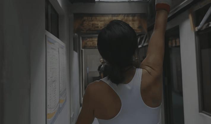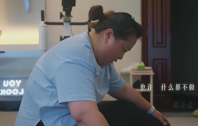 还有幕后训练的视频中能看到她笨拙得使用健身工具,累得满身汗,头昏脑涨地坐在地上,大口喘着粗气。