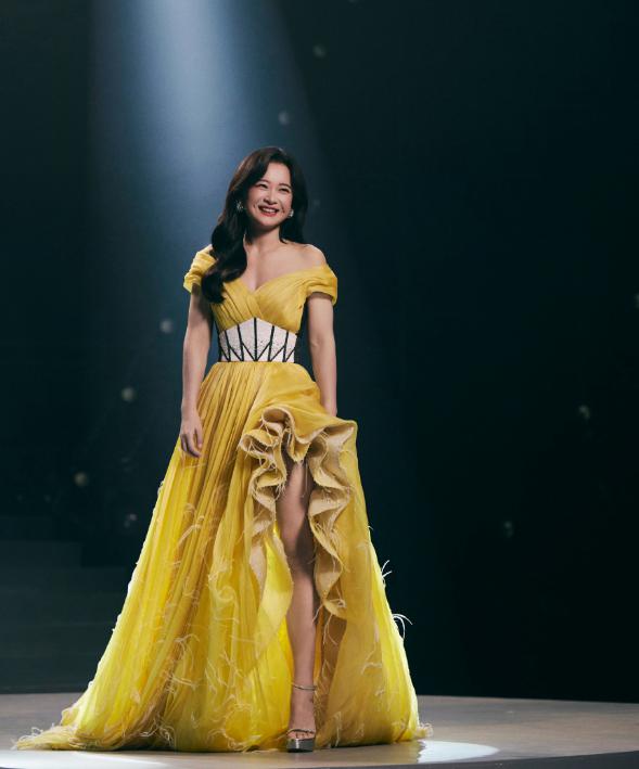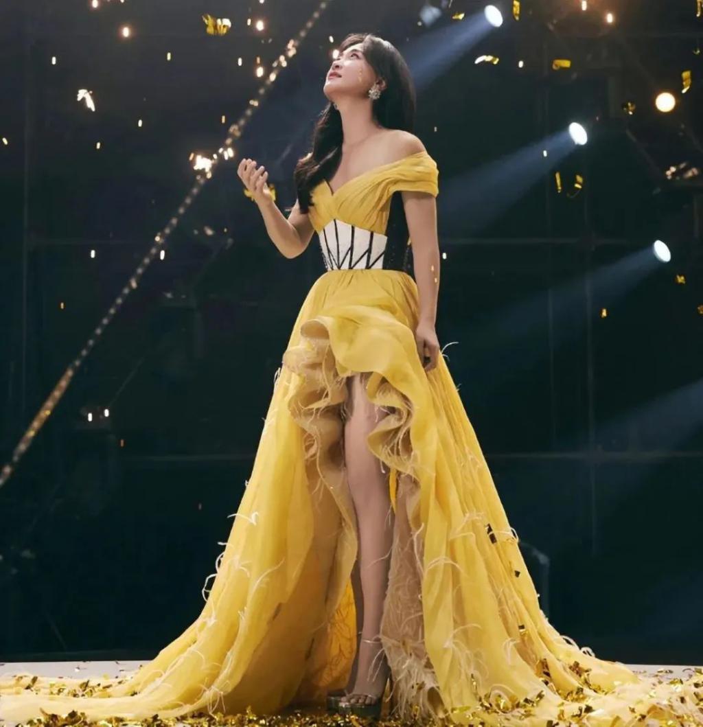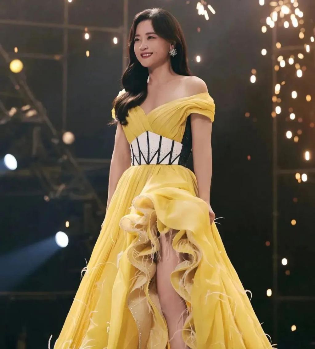贾玲拥有了大波浪的发型,穿着明黄色一字肩大 V 领礼服。