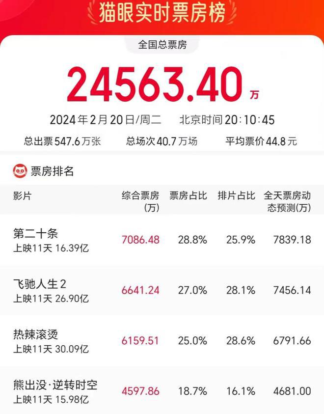 《第二十条》在排片低于《热辣滚烫》和《飞驰人生 2》的前提下,上座率大幅领先,首次实现逆势反超,登顶夺冠。