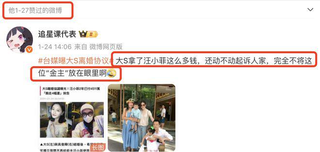 最近汪小菲还点赞了八卦博主的动态,似乎是在发泄,暗示大 S 没有把自己这位金主放在眼里。