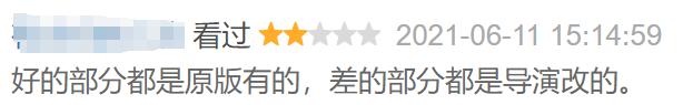 但就这三成,也没有躲过豆瓣网友的锐评" 好的部分都是原片有的,差的部分都是导演改的 "。