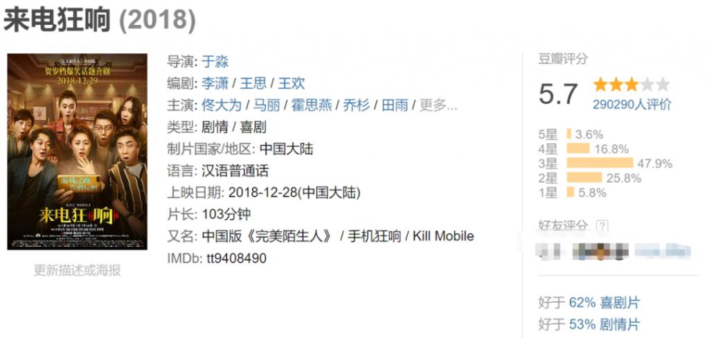 2018 年,佟大为、马丽主演的《来电狂响》,票房 6.41 亿,豆瓣评分 5.7。