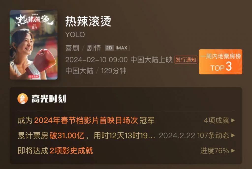 2 月 23 日 0 点,《热辣滚烫》票房突破 31 亿,跻身中国影史票房 TOP17。