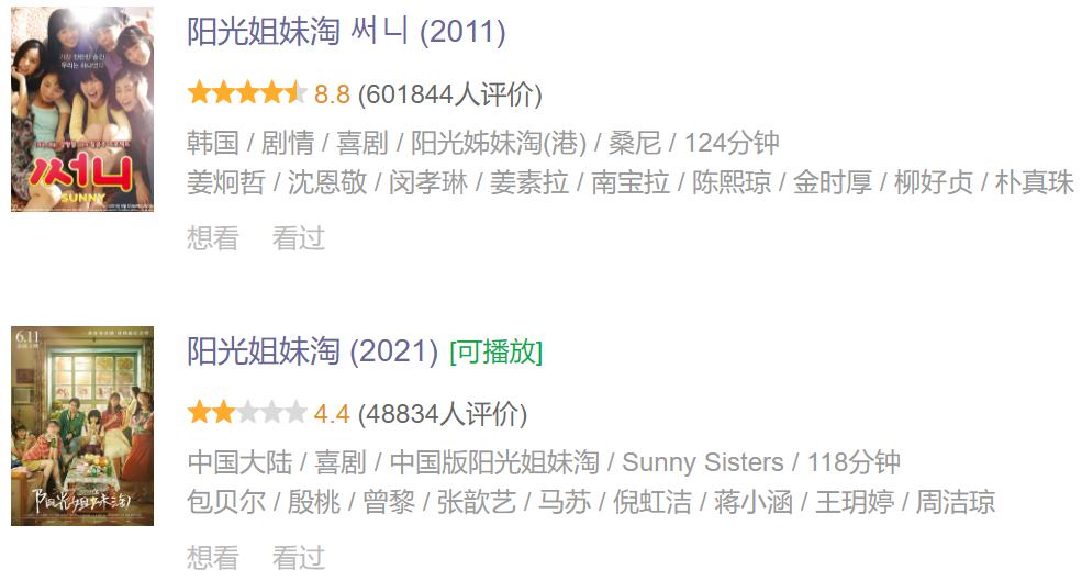 同年 6 月,包贝尔将原版豆瓣 8.8 的《阳光姐妹淘》,改编成了 4.4 分的国产版。