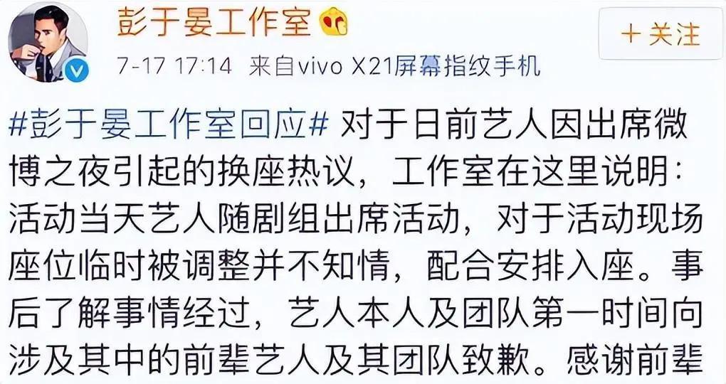 这不仅仅是表明自己强硬的态度,更是给主办方来了一个下马威,毕竟从后来彭于晏工作室发布的声明来看,这次换座风波是主办方 " 临时调换 " 所导致的。