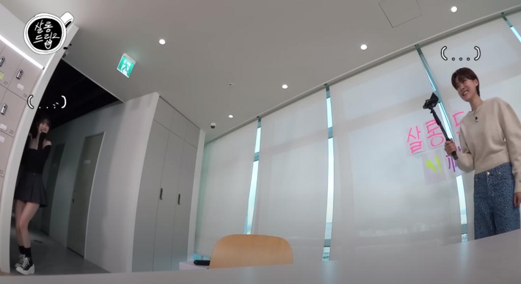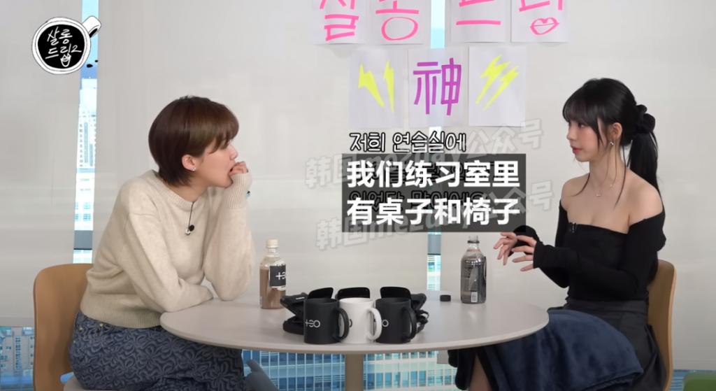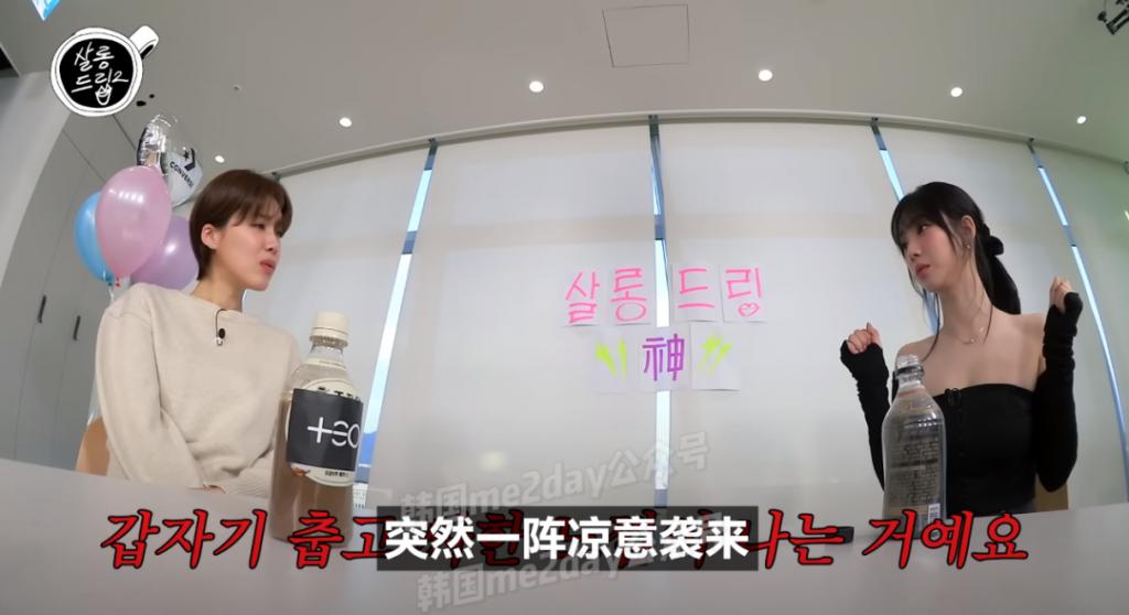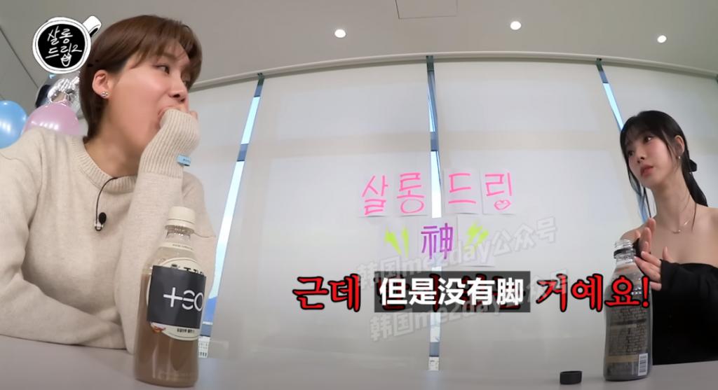 有一天 KARINA 独自留在了练习室,在空调后的一个三角区睡着了,突然一阵凉意袭来,她还以为其他成员回来了,结果一看并没有,但看见有人坐在凳子上趴在桌子上晃动着脚,但又只看到了小腿,没有脚 ... 而背景看起来就像一个练习生少女 ...