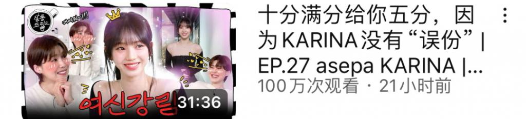 前不久 aespa 成员 KARINA(刘知珉)出演了张度练主持的油管节目《Salon Drip2》,当天 KARINA 在节目中公开了很多关于自己的 TMI,吸引了粉丝网友们的关注,公开还不到 24 小时就已经突破 100 万点击量了!
