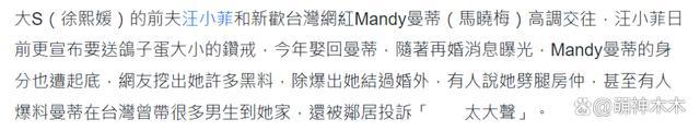 面对这个疑问,又有台湾省网友开始爆料。该网友在某论坛发帖称 Mandy 婚后并不安分,因为老公常在海外,所以 Mandy 独守家中时,先是劈腿房产经纪人,之后又经常带着不同的男性友人来到家中,后来因为其行为太过扰民,严重影响到邻居的生活,遭到邻居投诉。起初物业方面还以为是 Mandy 的老公乱来,后来才了解清楚,还把这一情况转告男方。同时,该网友声称这只是冰山一角,暗指掌握着 Mandy 的大量黑料。