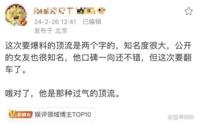 看上去有种墙倒众人推的势态,为了更快锤死这位翻车的男顶流,另一位娱乐博主也放出消息,似乎还担忧爆料的后果。