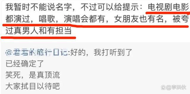 这位博主表示暂时不能指名道姓,但可以给些提示,比如男顶流被点赞过是有担当的真男人,并表示已经确定了真顶流,让大家拭目以待他的这次塌房。